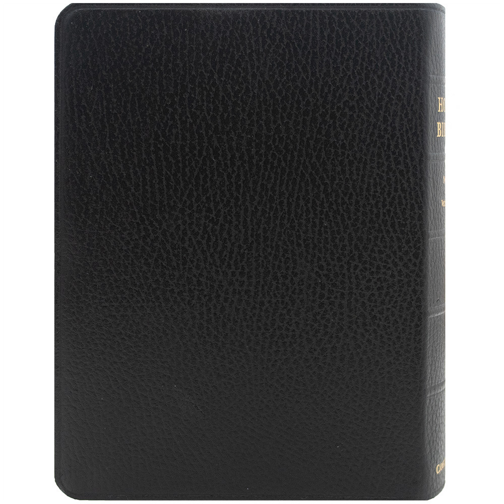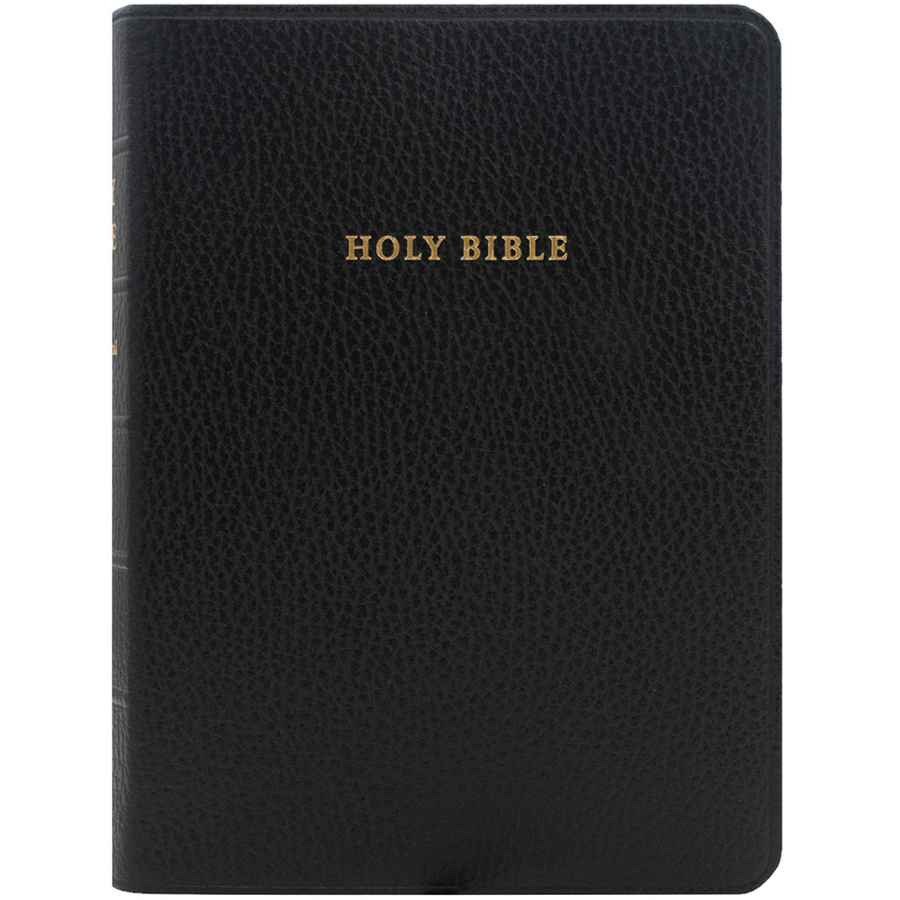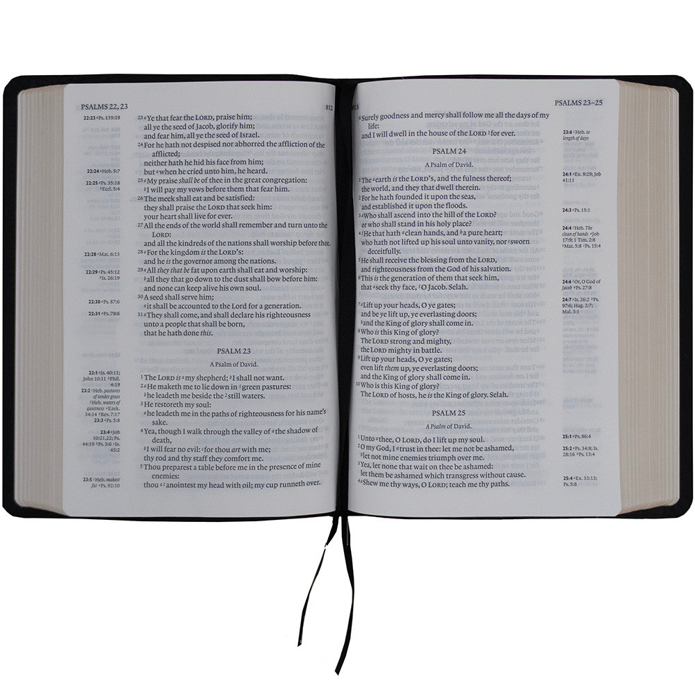 Published by Cambridge University Press, this King James Version of the Bible is arranged in a single-column, paragraph format with a clear, modern font for ease of reading. Cross-references and notes are placed in the outer margins, keeping the main text uncluttered. The Bible features thin India paper and gold-edged pages, and is bound in black calf split leather with two ribbon markers.