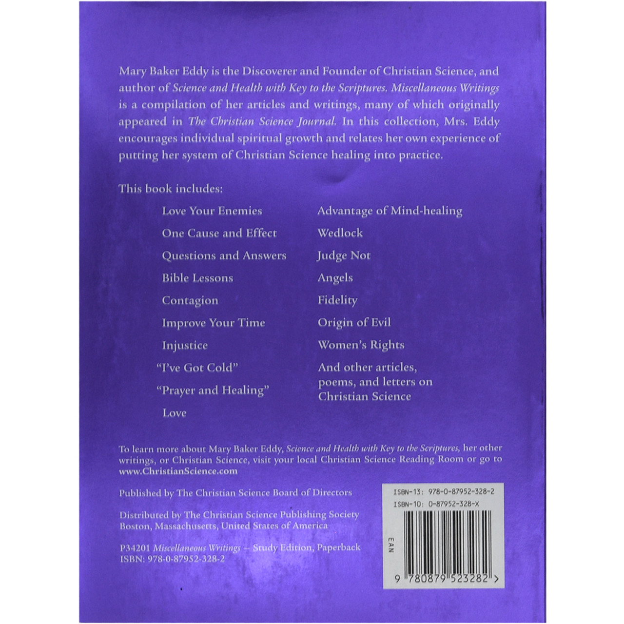 Between 1883-1896, Mary Baker Eddy wrote many articles, letters, and poems to support and encourage the growing membership of the Christian Science church she founded. Many were first published in The Christian Science Journal. Mary Baker Eddy published them as this separate book, Miscellaneous Writings 1883-1896. She suspended all Christian Science teaching for one year, urging the study of this book in its place.