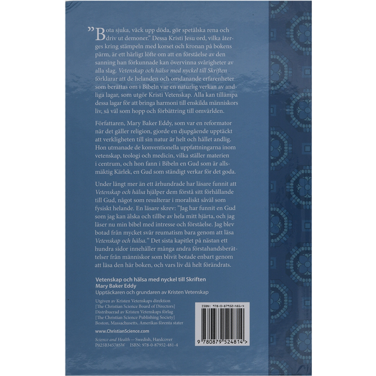 Vetenskap och hälsa med nyckel till Skriften är baserad på Bibeln och är den grundläggande läroboken i Kristen Vetenskap. Den utforskar vårt förhållande till Gud samt bönens makt när det gäller att fylla alla mänskliga behov. Författaren Mary Baker Eddy visar hur Bibeln hjälper oss att förstå och tillämpa Guds andliga lagar i ett tillförlitligt system för helande.